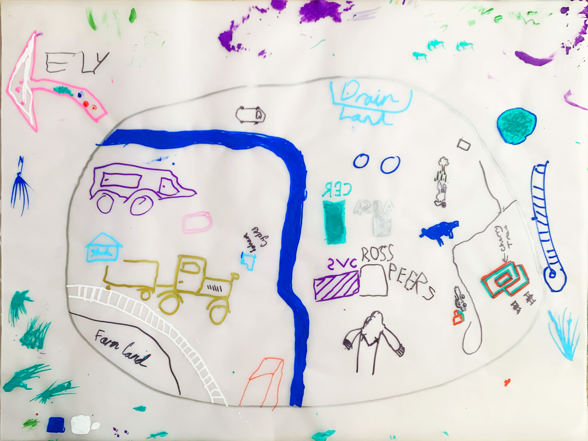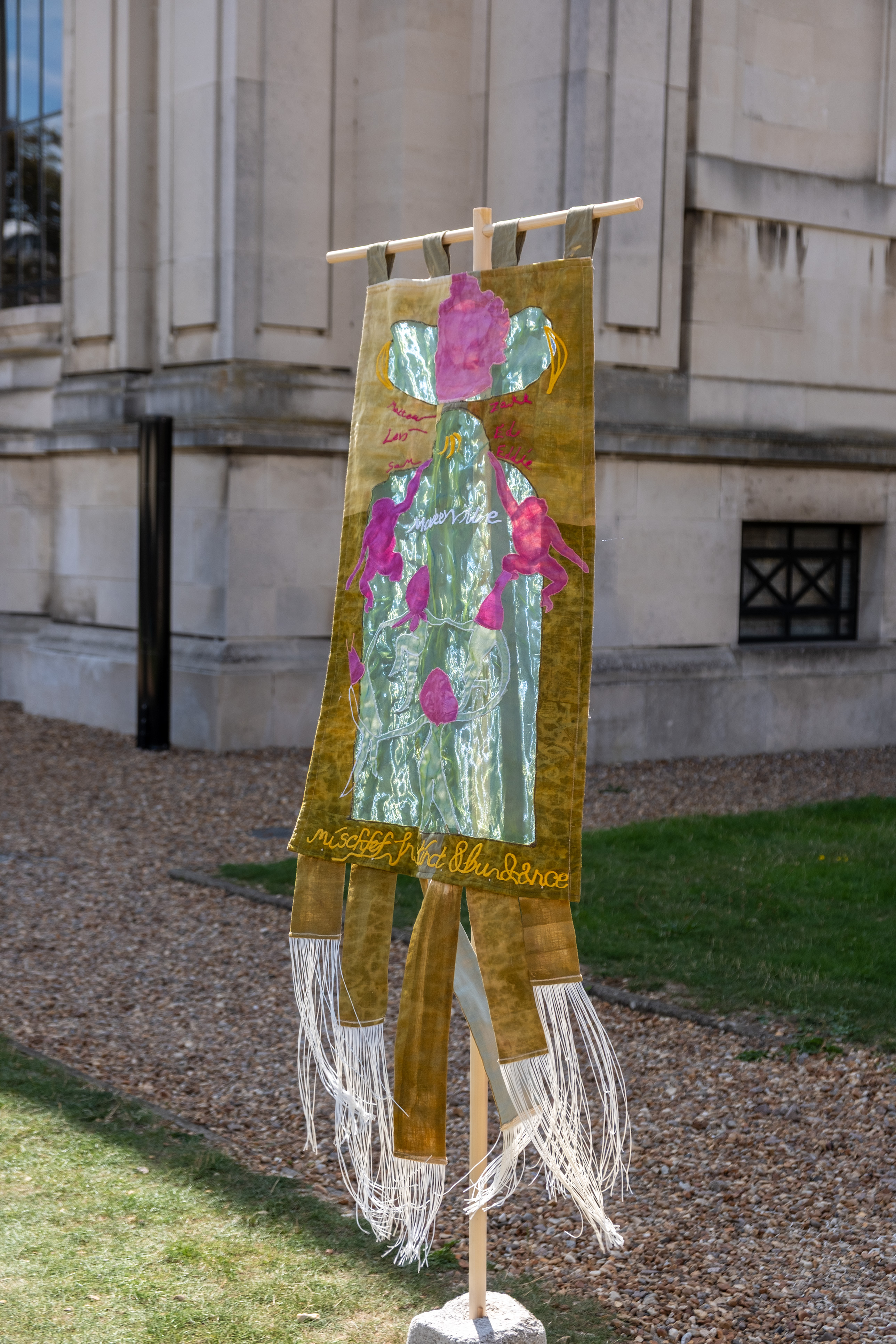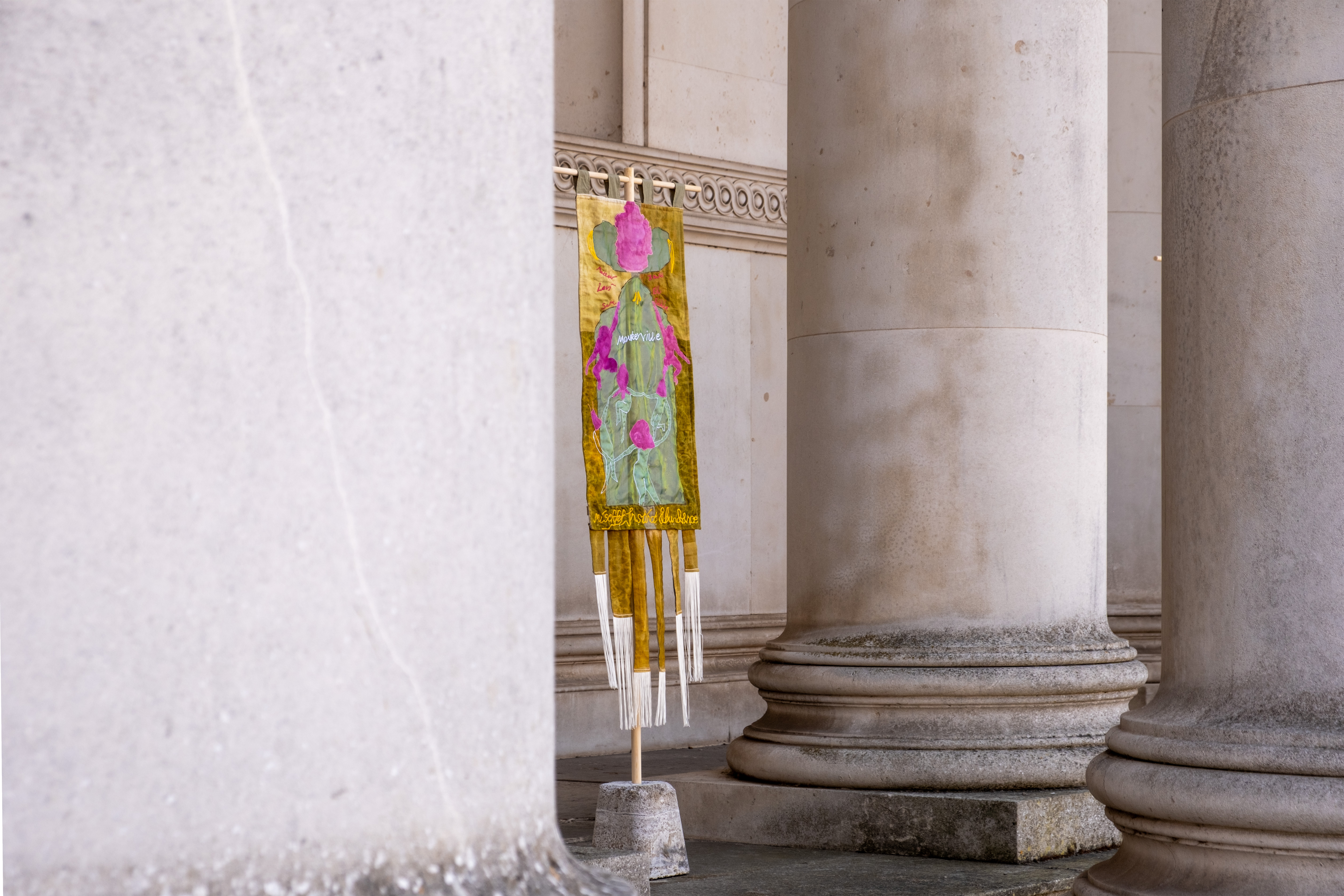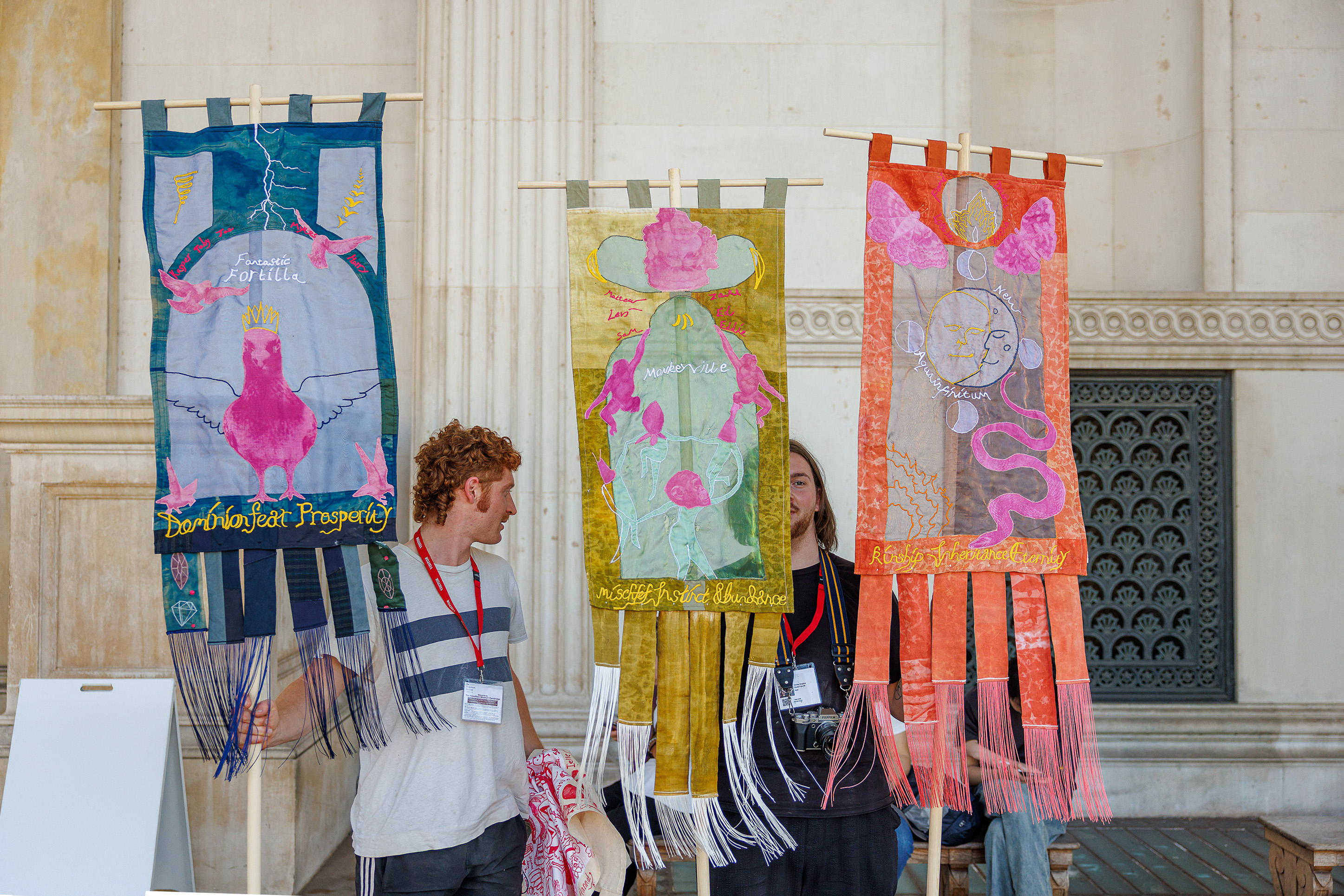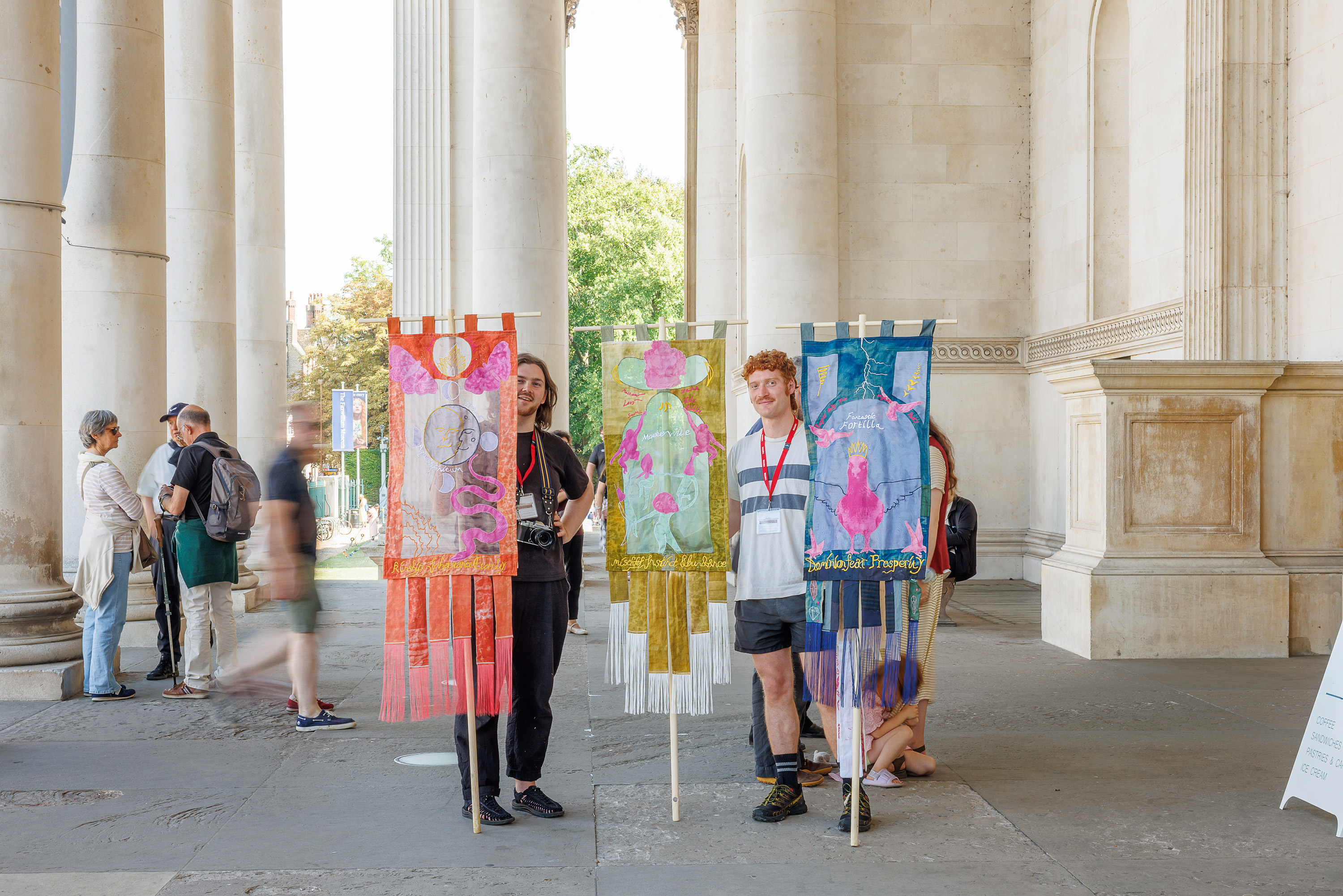 Banner series co-designed by young researchers in Cambridgeshire, working in collaboration with Studio Futurall to imagine future post-carbon towns. Taking inspiration from the Fitzwilliam Museum's collection of medieval manuscripts, the project mobilizes archival imagery of medieval pre-carbon towns to speculate on future, post-carbon towns. Each banner imagines a different scenario, from living in fear of nature to embracing play and abundance.