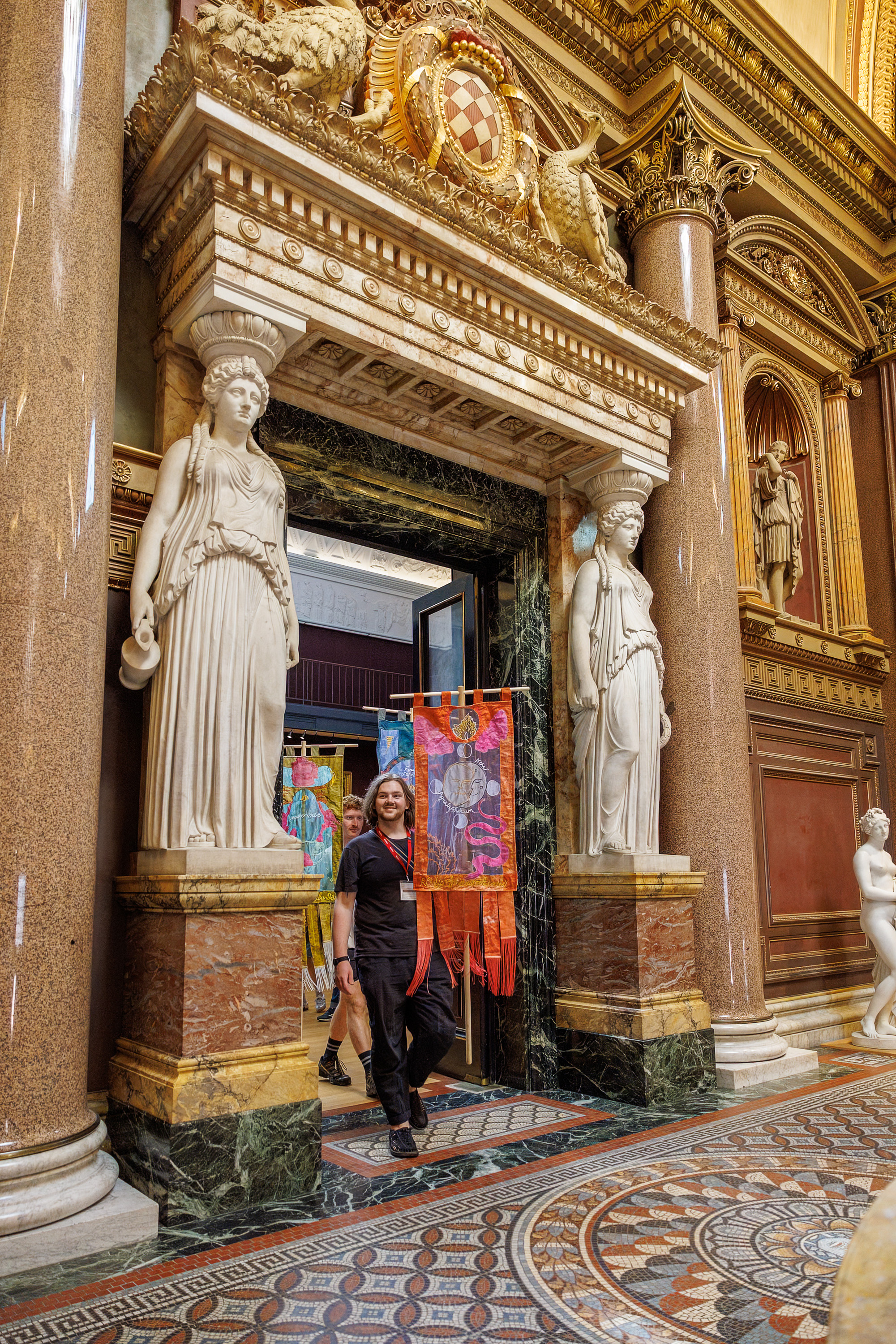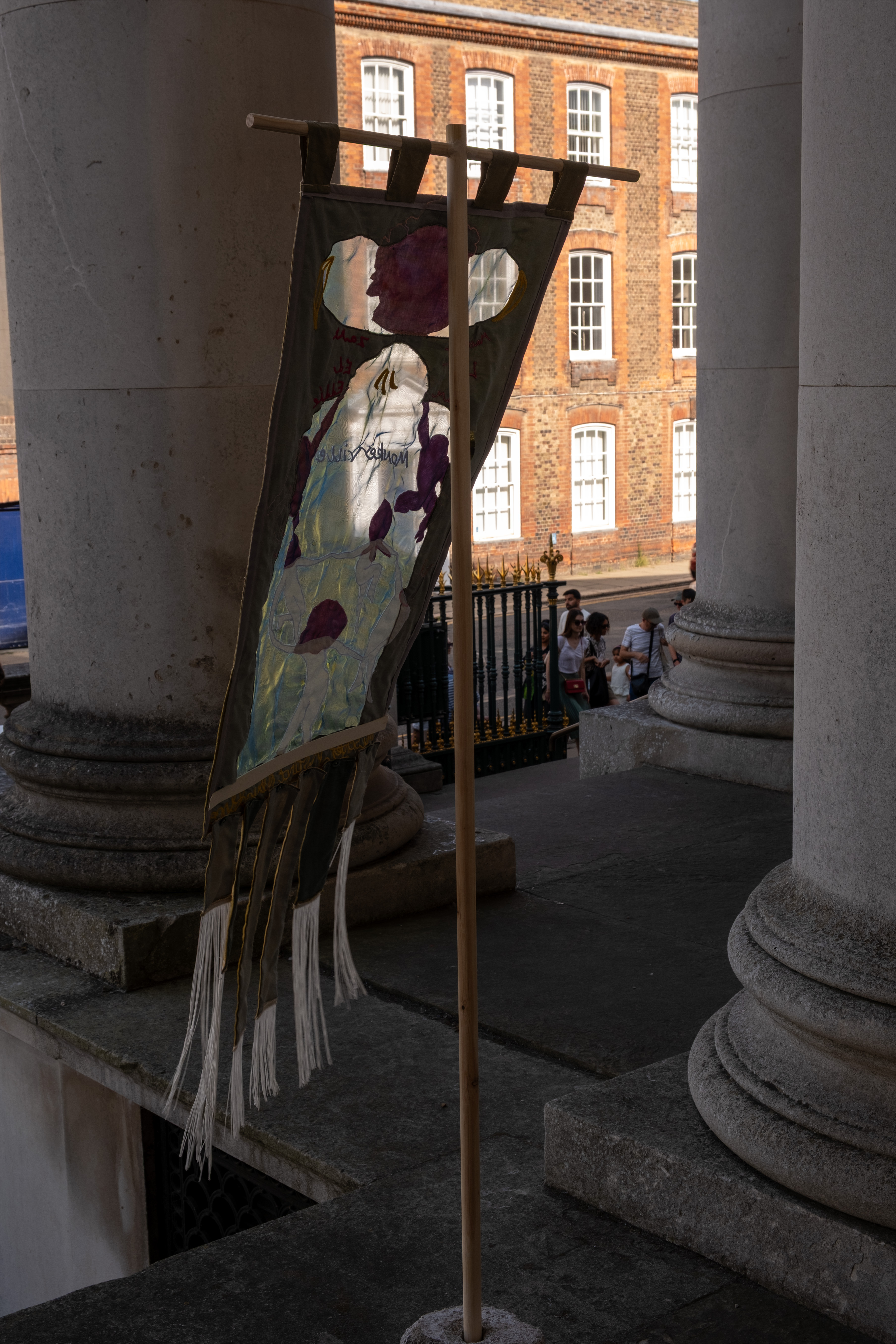 Each banner is formed from upcycled linen which is printed unto using Solarfast and cyanotype to reproduce archival imagery, which I then embroidered unto. Organza panels "illuminate" these ideas much like gold leaf illuminated the source imagery. Each banner also bears the name of the young researchers whose ideas informed the design.